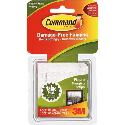 Removes cleanly without surface damage. Command™ Picture Hanging Strips are ideal for hanging pictures. Command™ white & clear hooks are ideal for hanging a range of items including keys, calendars, utensils, decorations and more.