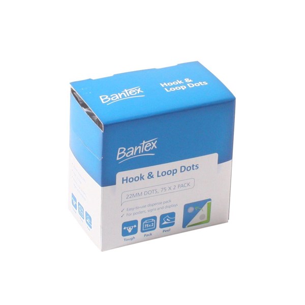 75 x 22mm hook dots, 75 x 22mm loop dotsIdeal for home, classroom and office useGreat for posters, expos, signs, school artworks and displaysEasy to use dispenser pack or convenient bulk rollsSelf – adhesive dots will adhere to most smooth surfacesMess free and easy to use for displaying or fasteningStrong hold to secure your items so they won’t fall down or moveUseful for organising items that are used frequently