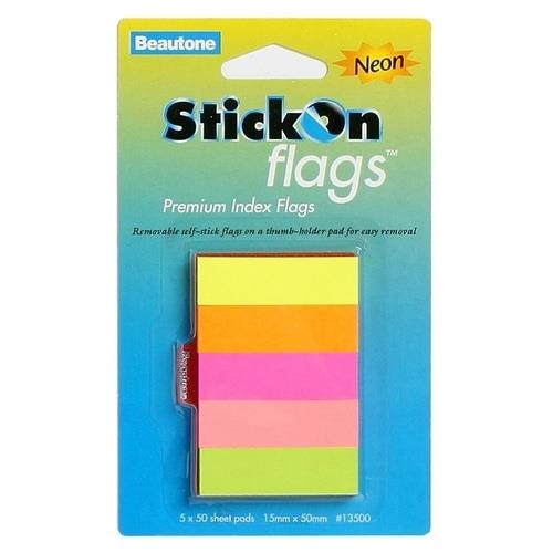 Beautone Stick On Index Flags - Neon 5 Colours -15x50mm - Pk 250