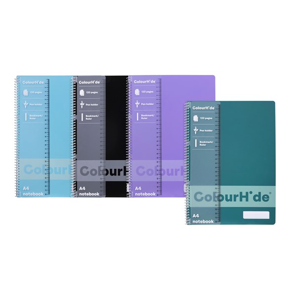 COLOURHIDE PP NOTEBOOKS A4 120 Page Assorted Colours - Navy Blue, Purple, Black, Orange, Light Blue