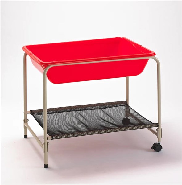 Folding sturdy steel frame with a nylon shelf and two casters to allow easy movement around the classroom