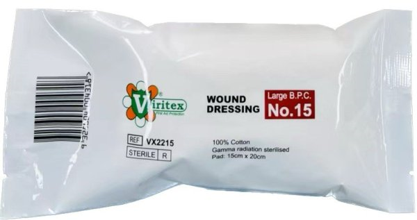 Pad 15cm x 20cm, Bandage 7.5cm x 3.5m.