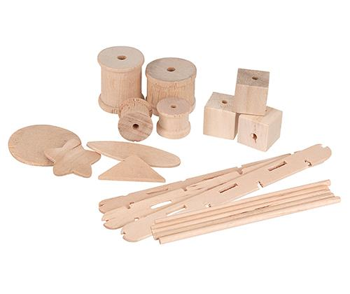 Includes wooden shapes, sticks, spools, cubes and construct-a-sticks.