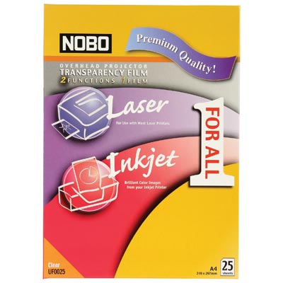 Nobo® transparency films offer high quality image reproduction. Suitable for plain paper copiers and laser and inkjet printers. Clear background.