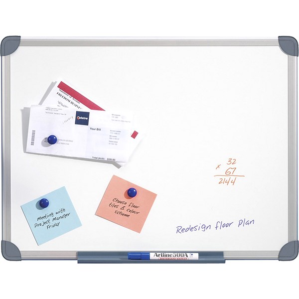 - Slim design minimises protrusion from the wall.; - Contemporary aluminium frame for efficient use in any environment.; - High quality dry erase steel surface.; - Magnetic surface allows the board to be used as bulletin board.; - Includes pen tray, marker and wall mounting kit.;