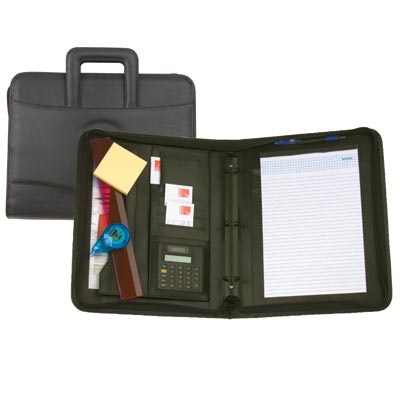 Leather-look finish with 3 'O' ring binder, pen clip, notebook of 30 pages, calculator, 6 compartments & pockets. Includes drop handles for easy carrying when closed