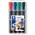 Excellent smudge proof and waterproof qualities on almost all surfaces. Dries in seconds, therefore ideal for left handed users. Colour intensive, low-odour and lightfast. DrySafe ink can be left uncapped for days without drying up. Chisel tip with line width 2.0mm or 5.0mm. Wallet of 4 (black, blue, green & red) converts into a convenient desk stand.